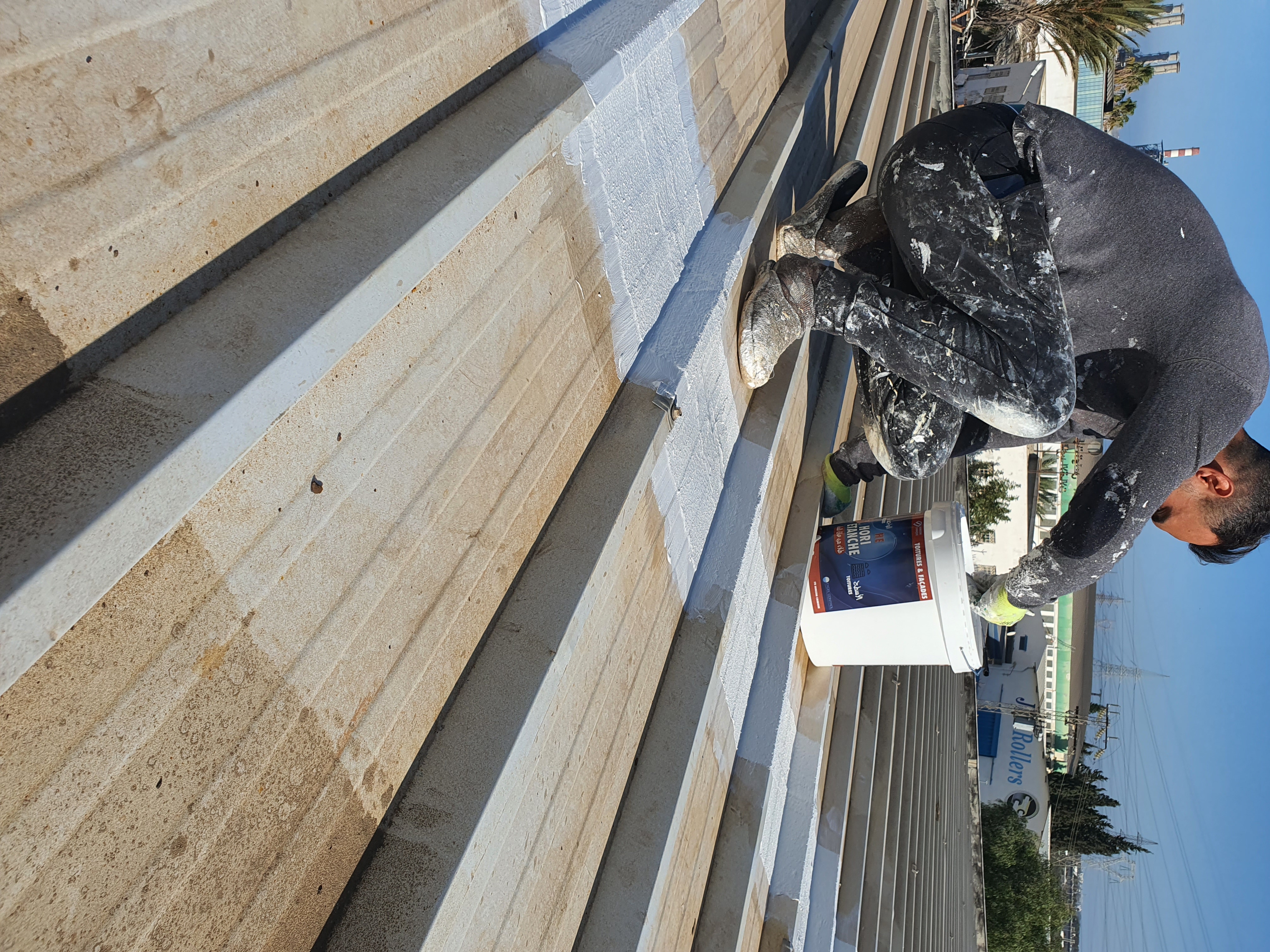 Traitement anti-rouille et peinture d'étanchéité sur toiture industrielle en bac acier.