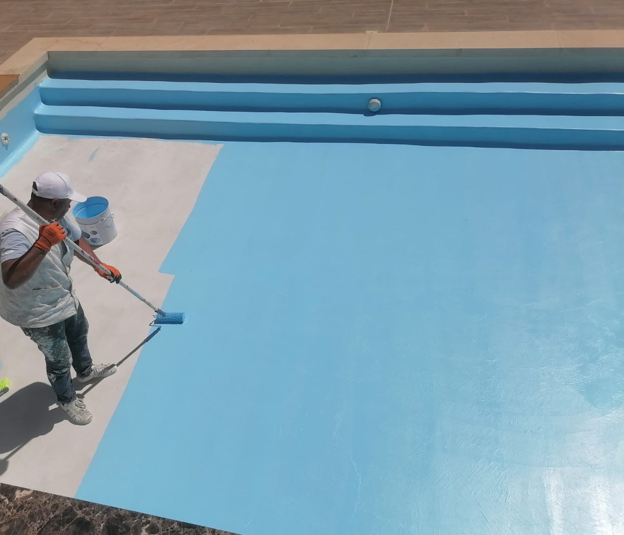Colmatage de fissures et application de résine spéciale piscine. Le bassin est maintenant 100% étanche.